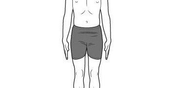 In profile, the ears, shoulder joints, and hip joints are kept in line with the ankle joints. The feet are grounded and the knees and thighs are lifted up and back against the inner buttocks moving forwards. The breast bone and pubic bone move forward and lift up and the lower ribs and navel move back.